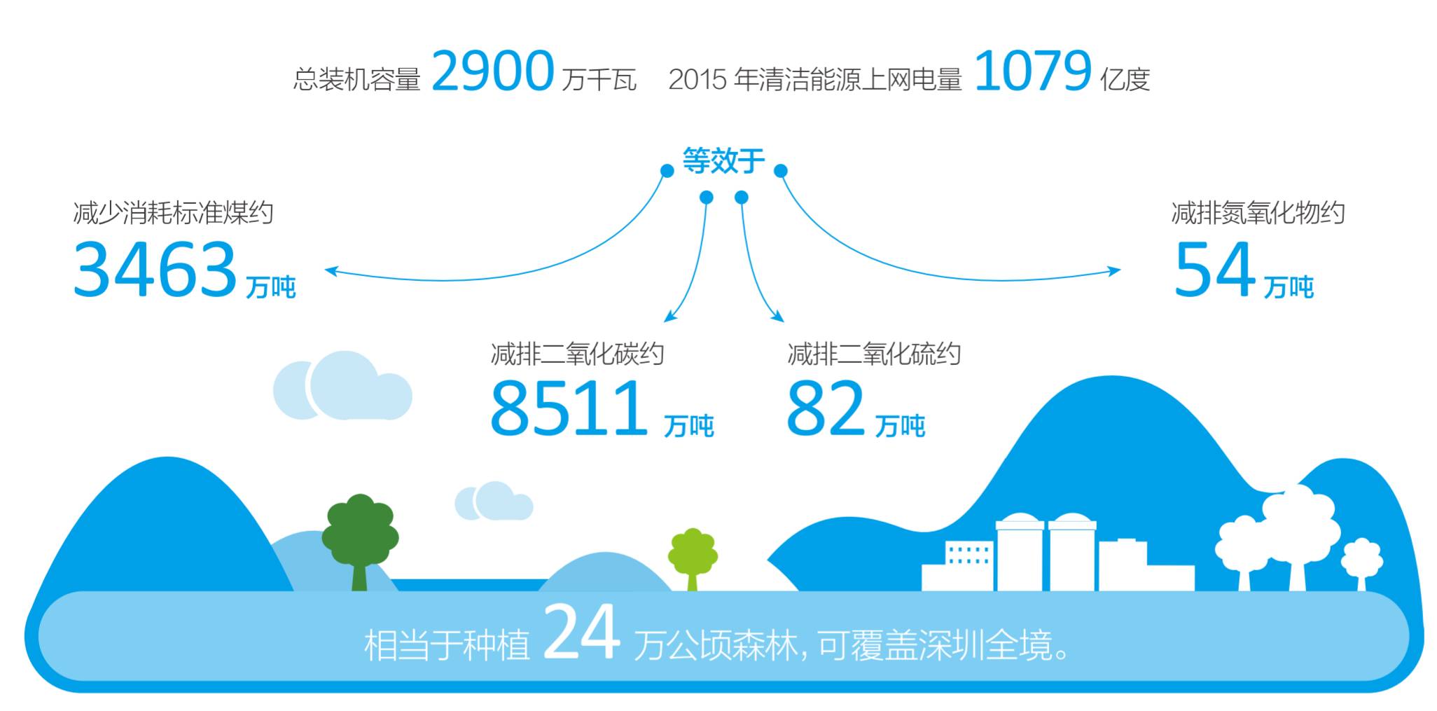 當(dāng)今氣候變暖已經(jīng)成為人類未來健康的挑戰(zhàn),發(fā)展清潔能源、創(chuàng)造一個可持續(xù)發(fā)展的美好未來是我們的責(zé)任。我們?nèi)轿婚_發(fā)核電、風(fēng)電、水電、太陽能等清潔能源,2015年總裝機容量為2900萬千瓦,清潔能源上網(wǎng)電量1079億度,折合減排溫室氣體8647萬噸,相當(dāng)于造林24萬公頃,可以覆蓋整個深圳。